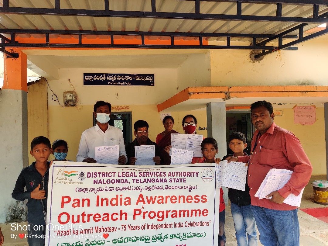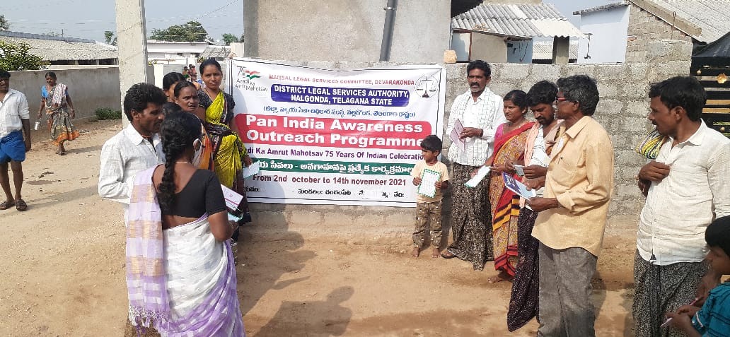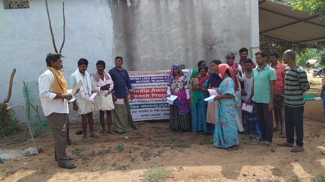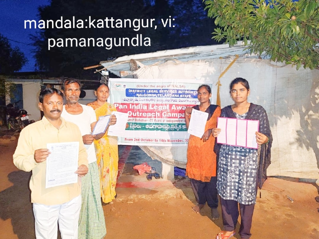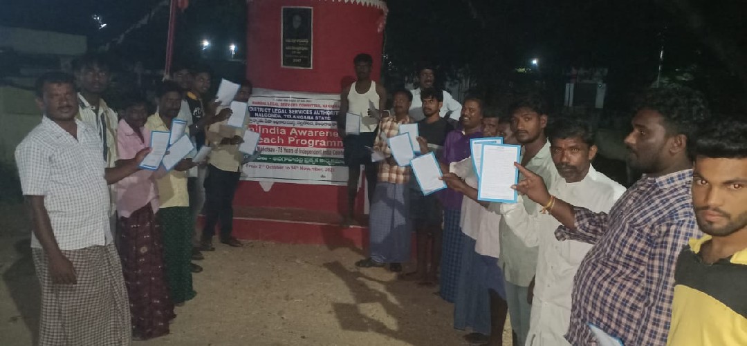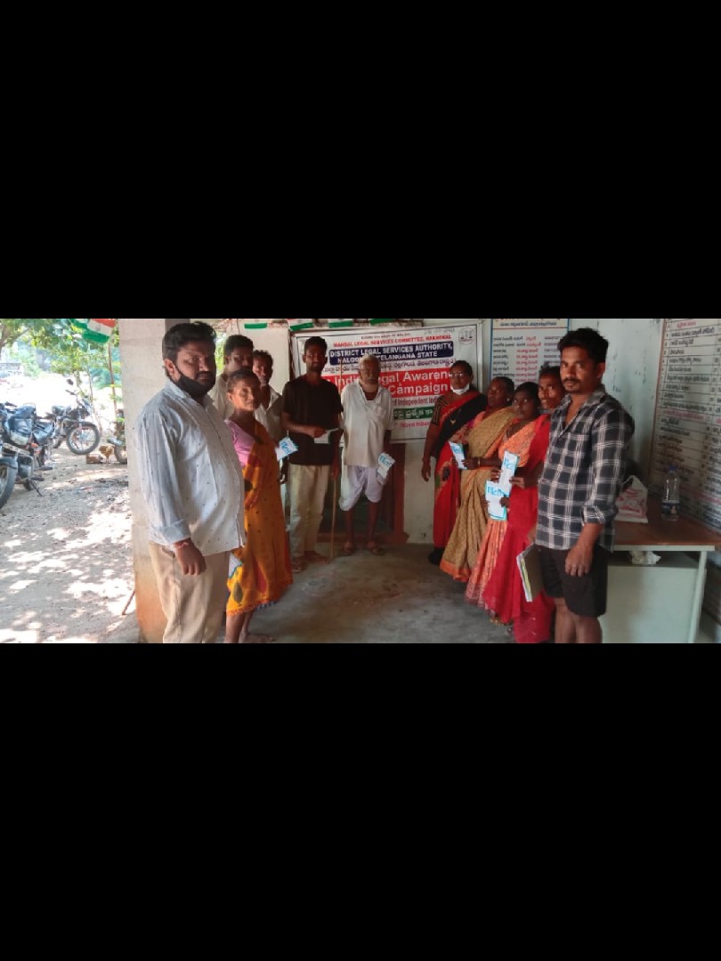 ఈ రోజు కార్యక్రమం నల్గొండ మండలం అప్పాజిపేట గ్రామ పంచాయతీలో ఉచిత న్యాయ సేవా సంస్థ ఆధ్వర్యంలో చట్టాలపై అవగాహన , కరపత్రాల పంపిణీ జరిగింది. పారా లీగల్ వాలంటీర్స్ ఎం.డి వాహిద్, భీమనపల్లి శ్రీకాంత్ , ఆశా వర్కర్ , అంగన్వాడి టీచర్ సిబ్బంది, గ్రామ పంచాయతీ సిబ్బంది తదితరులు పాల్గొన్నారు.