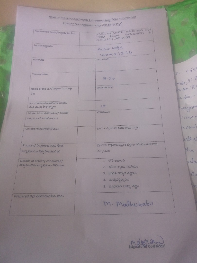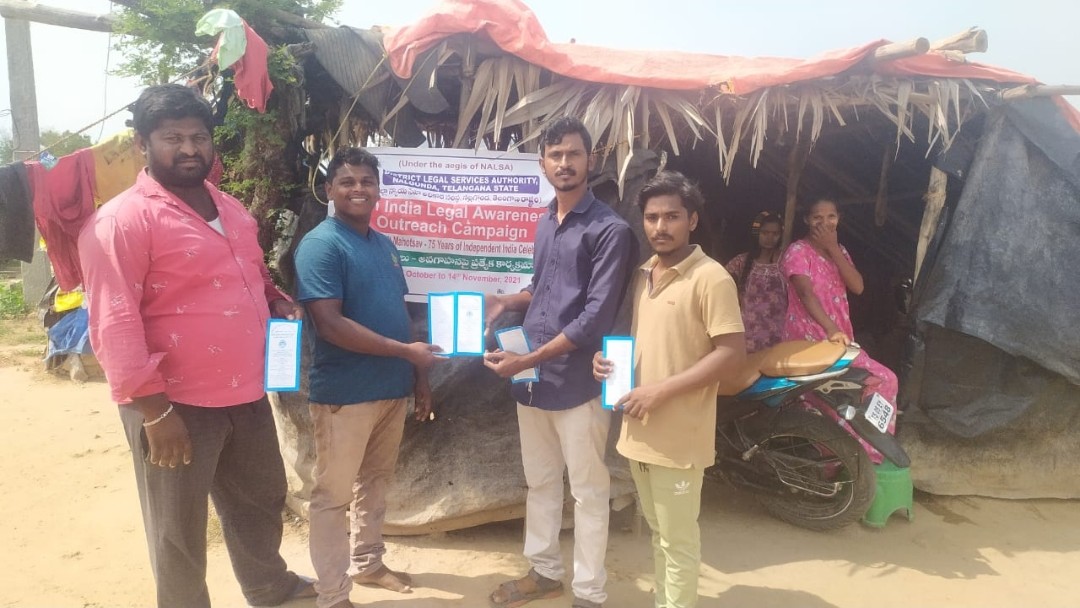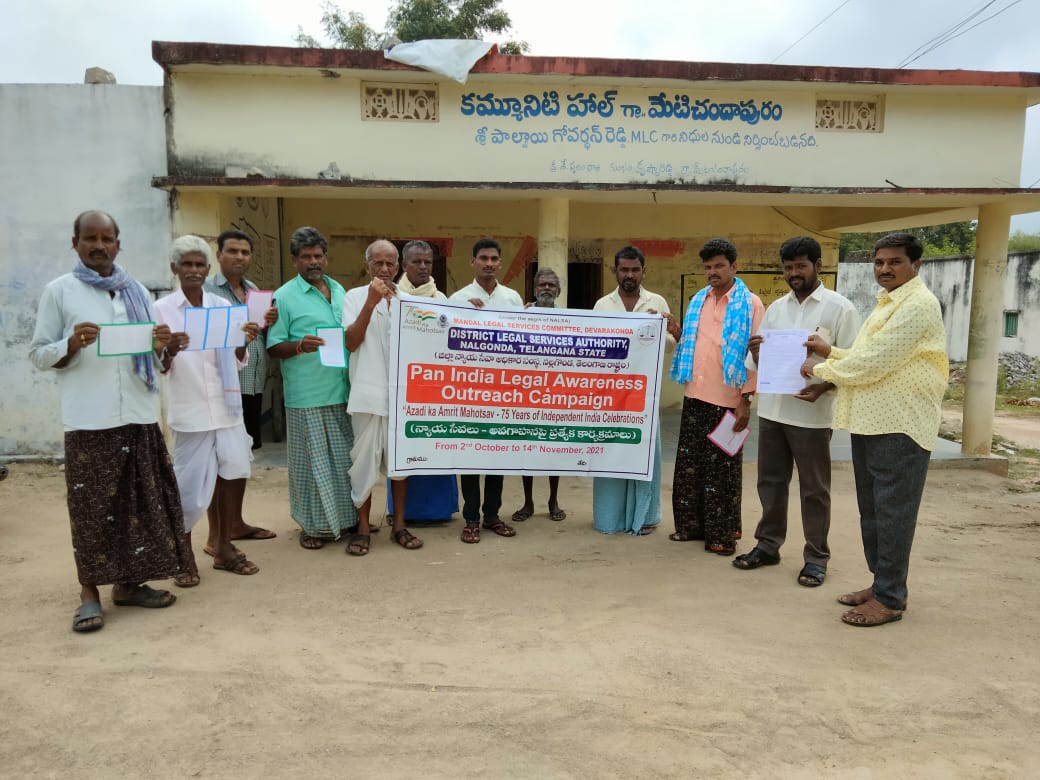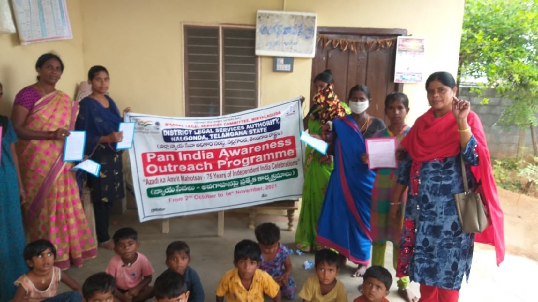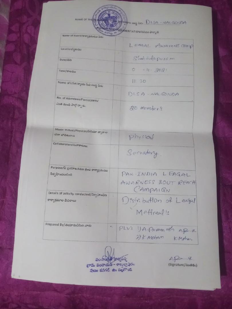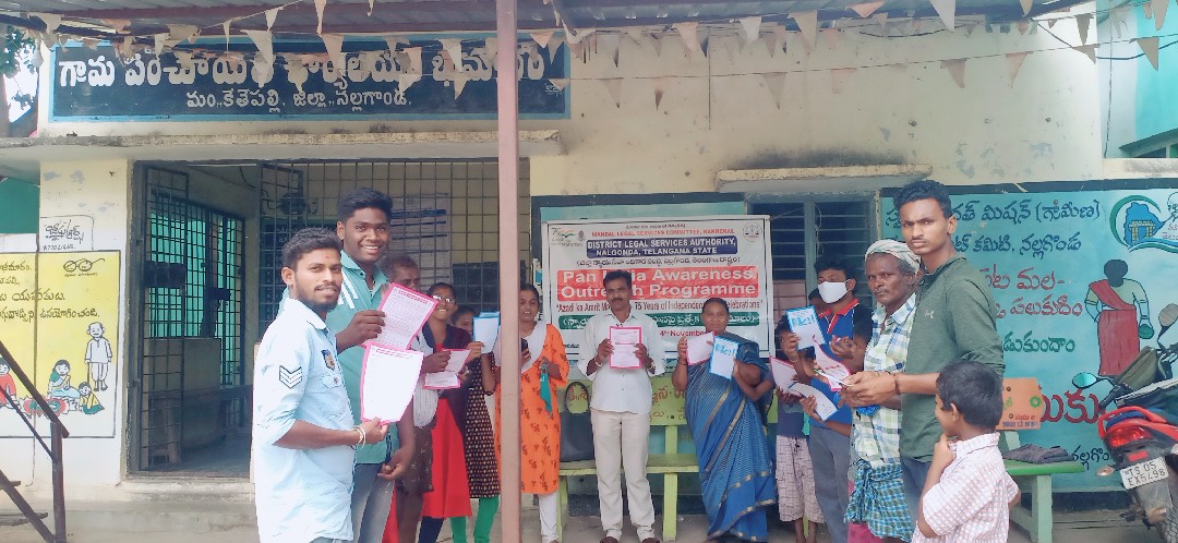 ఈ రోజు కార్యక్రమం నల్గొండ మండలం అప్పాజిపేట గ్రామ పంచాయతీలో ఉచిత న్యాయ సేవా సంస్థ ఆధ్వర్యంలో చట్టాలపై అవగాహన , కరపత్రాల పంపిణీ జరిగింది. పారా లీగల్ వాలంటీర్స్ ఎం.డి వాహిద్, భీమనపల్లి శ్రీకాంత్ , ఆశా వర్కర్ , అంగన్వాడి టీచర్ సిబ్బంది, గ్రామ పంచాయతీ సిబ్బంది తదితరులు పాల్గొన్నారు.