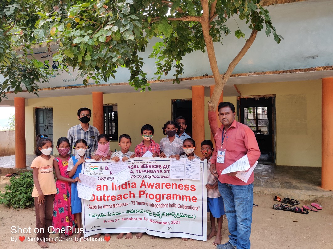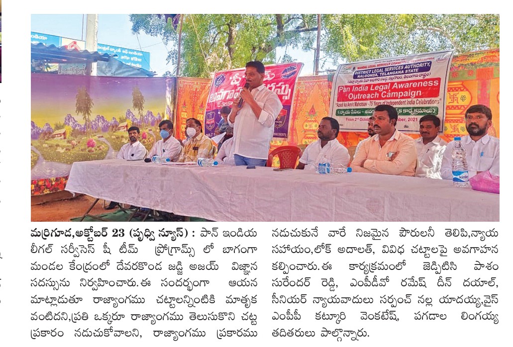 *30౼10౼2021 శనివారం రోజున మర్రిగూడ మండలంలోని భీమనపల్లి గ్రామంలో ఉచిత న్యాయ సేవల అవగాహన సదస్సు కార్యక్రమం నిర్వహించడం జరిగింది ఈ కార్యక్రమానికి దేవరకొండ న్యాయవాదులు అశోక్,రమేష్ గార్లు మరియు మర్రిగూడ మండలం అధికారులు MPDO రమేశ్ దీన్ దయల్ గారు మరియు మర్రిగూడ మండల పార లీగల్ వాలేంటరీస్ కొలుగూరి ప్రవీణ్ పగడాల లింగయ్య గ్రామ సర్పంచ్ కుంభం శ్రీనివాస్ రెడ్డి ఉప సర్పంచ్ మరియు వార్డ్ మెంబర్స్ గ్రామ ప్రజలు ముఖ్య అతిథులుగా రావడం జరిగింది ఈ కార్యక్రమానికి ప్రజా ప్రతినిధులు అధికారులు గ్రామాల ప్రజలు అవగాహన పెంచుకోవడం జరిగింది